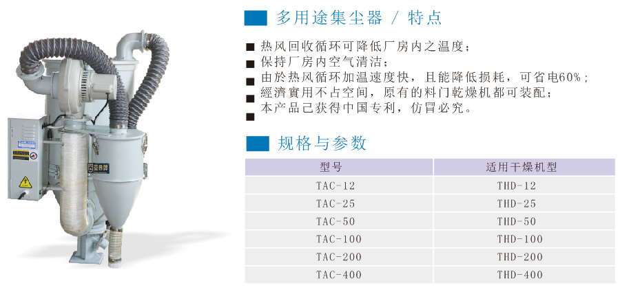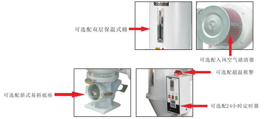 采用均匀分散热风之高性能热风扩散装置,保持塑料干燥温度均匀,增加干燥效率特有热风管弯型设计,可避免粉屑堆积于电热管底部,引起燃烧料桶内及内部零部件一律采用不锈钢制料桶内与底部分离,清料方便,换料迅速采用全数位式P.I.D控制,LED状态显示,可精确控制温度有过热保护装置,可减少人为或机械故障所发生之意外380V机型有风机过载保护器采用隔热型风机,延长机器寿命;