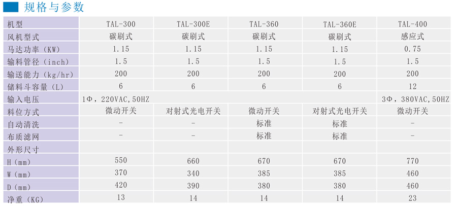 TAL-300/360可选配 TCH-6L 集料斗,方便原料暂时存储,TAL- 400可选配马达逆转除尘功能,可选配 TPV 两料比例阀 选配蜂鸣器或警报灯作为报警装置。