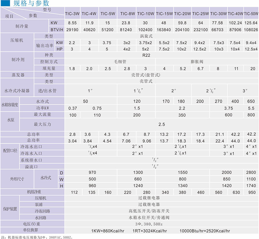 压缩机及泵浦均有过载保护;壳管式冷凝器,导热快,散热效果佳;
