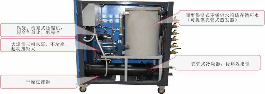 壳管式蒸发器,热交换效果好,制冷效果佳;采用精密温控表,精确控温;
